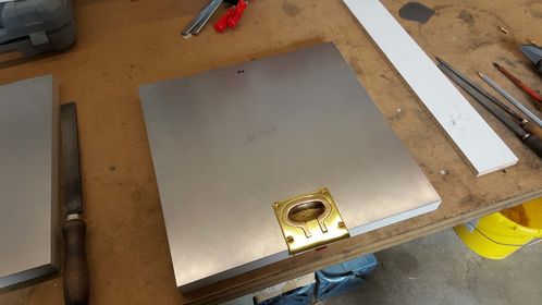 Als erste Teile des Aufbaus wurden die Türen und die vorderen Geräteraumklappen mit Blech beplankt. Hierzu wird spezielles Tiefziehblech verwendet.