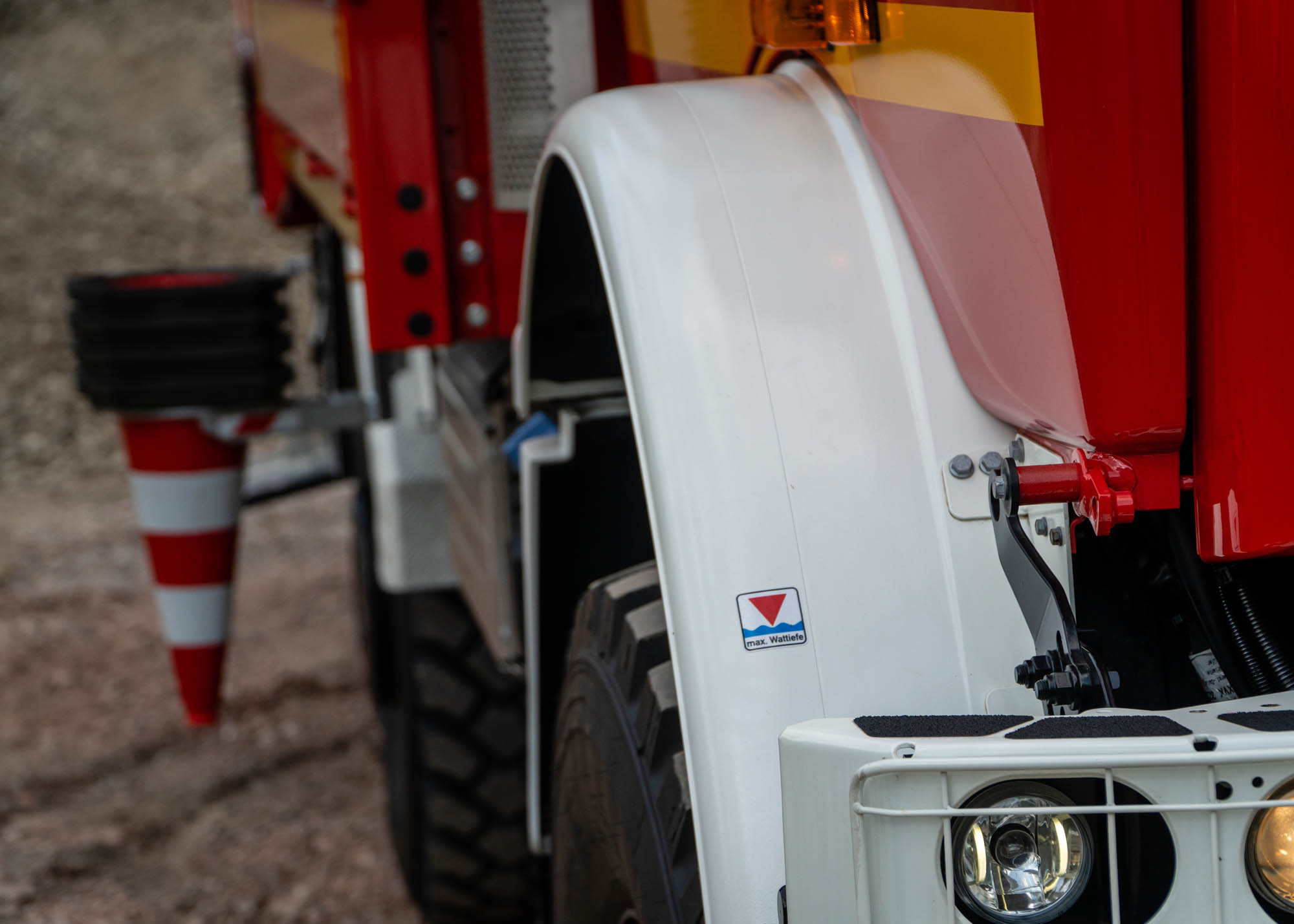 Das Unimog Fahrgestell verfügt über ein automatisiertes Schaltgetriebe sowie einer automatischen Reifendruckregelanlage. Alle Lampen unterhalb der Wattiefe von 1,20 Meter werden zudem automatisch im Bedarfsfall mit Überdruck versehen, um die Funktion zu erhalten. Am Heck ist ein Dhollandia Vertikallift verbaut um die Rollcontainer sicher auf das Fahrzeug und vom Fahrzeug auf den Boden verbringen zu können, aber den Rampenwinkel nicht einschränken zu müssen.