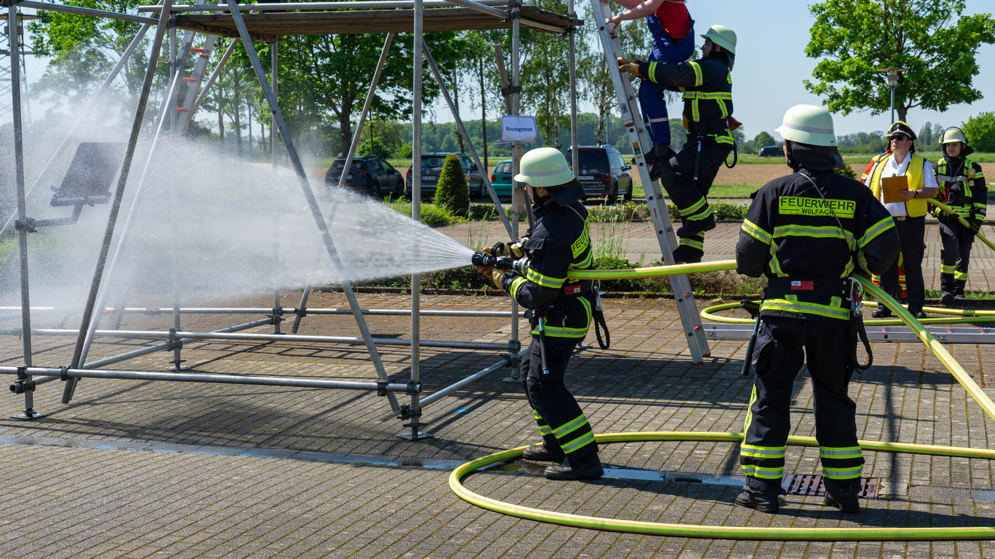 Beide Gruppen traten in der Leistungsstufe „Bronze“ an. Dabei gilt es im Rahmen einer Einsatzübung einen Löschangriff mit zwei Rohren und der Rettung einer Person aus dem ersten Obergeschoss durchzuführen.